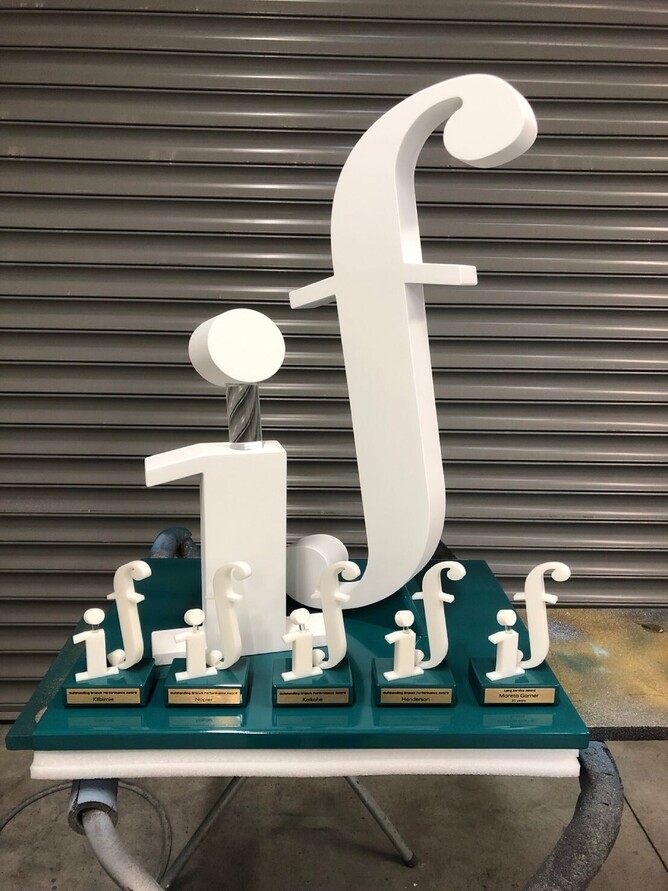 We can work with your company logos or paint things in your specific brand colours, arrange engraved plaques with names. We can even falsely weight the awards to give them that hefty sense of accomplishment.